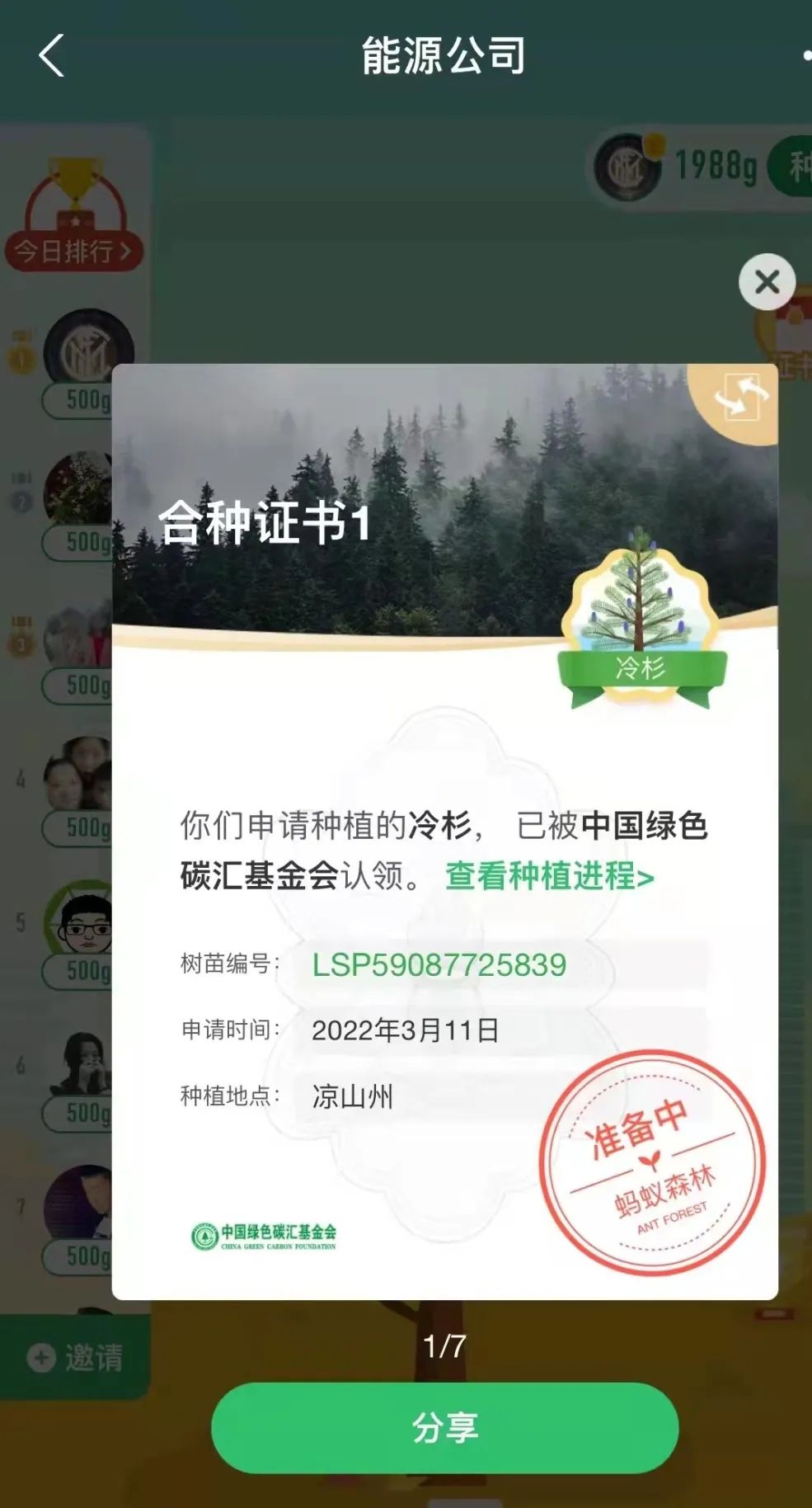 “一花一草皆生命,一枝一葉總關情?!痹缭?019年起,公司就通過支付寶螞蟻森林組建了一只“能源公司云種樹小隊”,如今隊伍人數(shù)越來越壯大,已有59位隊員,截止目前,在酒泉、大理、邯鄲等地,種下了冷杉、側柏、云杉、胡楊等7棵大樹。3月11日,在小伙伴的共同努力下,我們又種下了一棵冷杉樹,該樹被中國綠色碳匯基金會認領,將種植到?jīng)錾街莸貐^(qū)。